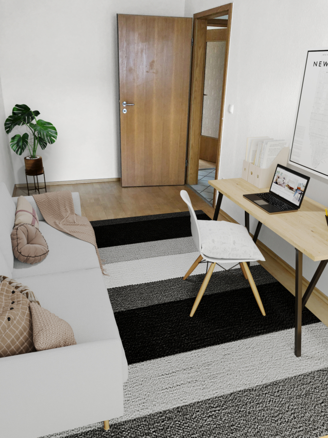 Aus Rücksicht auf die derzeitigen Mieter wurden die Fotos vor deren Einzug aufgenommen und anschließend digital möbliert. So erhalten Sie einen realistischen Eindruck der Räumlichkeiten, ohne die Privatsphäre der Bewohner zu beeinträchtigen.