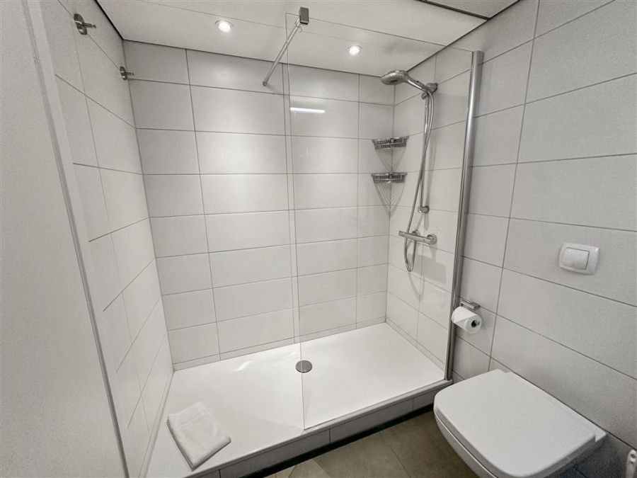 Beim Betreten des Apartments gelangen Sie in einen Flur mit integrierter Einbauküche auf der linken Seite. Rechts befindet sich das moderne Bad mit großer Dusche. Geradeaus öffnet sich der Wohn- und Schlafbereich mit direktem Zugang zum Balkon. Die Möblierung – unter anderem ein hochwertiges elektrisch verstellbares Boxspringbett (1,80 m Breite) – ist im Kaufpreis enthalten.